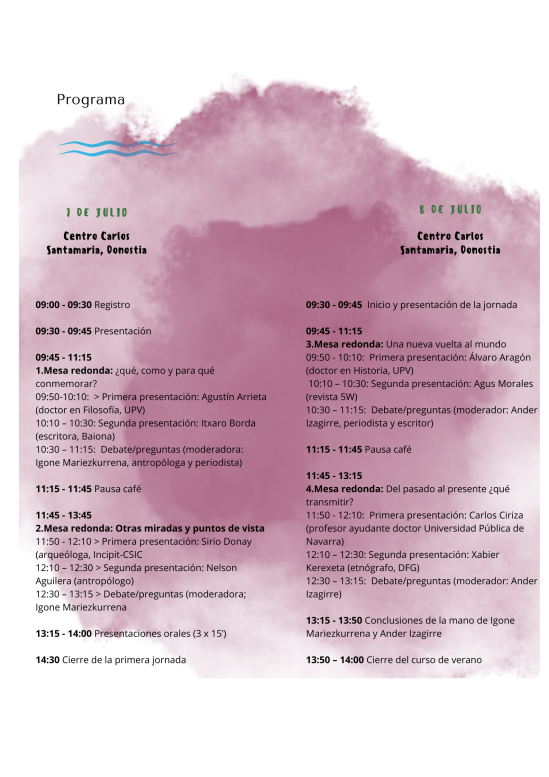 Moderadas por la antropóloga y periodista Igone Mariezkurren, el día 7 de julio tendrán lugar dos mesas redondas. La primera, '¿Qué, cómo y para qué conmemorar?' contará con la participación del profesor de filosofía de la UPV/EHU Agustín Arrieta y la escritora Itxaro Borda Idazlea. En la segunda, 'Otras miradas y puntos de vist' intervendrán la arqueóloga y antropóloga del INCIPIT Sirio Canós Donnay y el antropólogo de la Universidad Austral de Chile Nelson Aguilera.