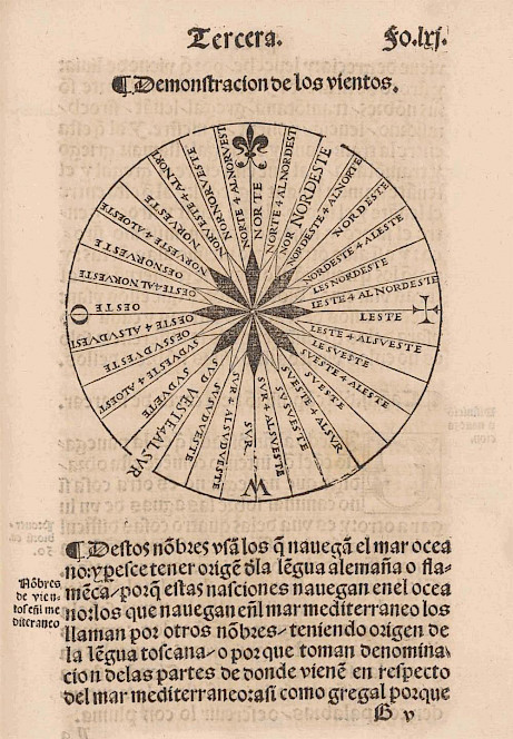 La distribución de la rosa en función de los vientos  mediterráneos carecía de utilidad para las navegaciones atlánticas.  Aquí, el círculo del horizonte se dividió en 32 direcciones equidistantes, o «cuartas», de 11,25º, aproximación  suficiente  para las necesidades de la época.