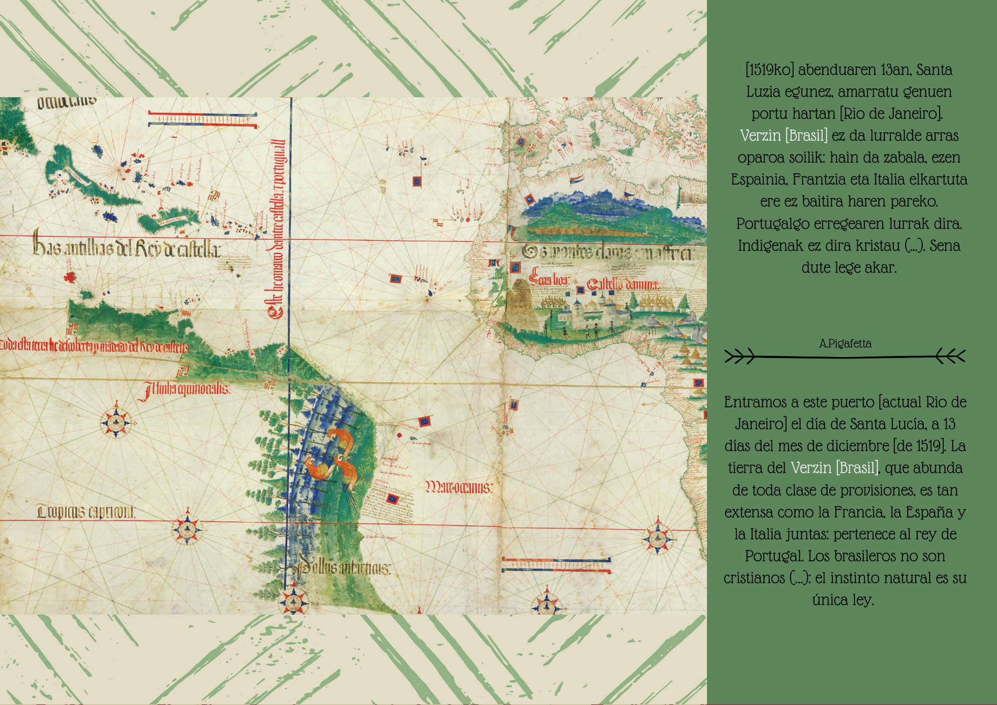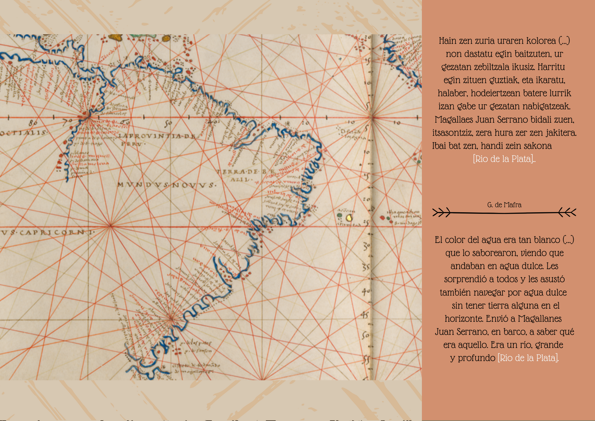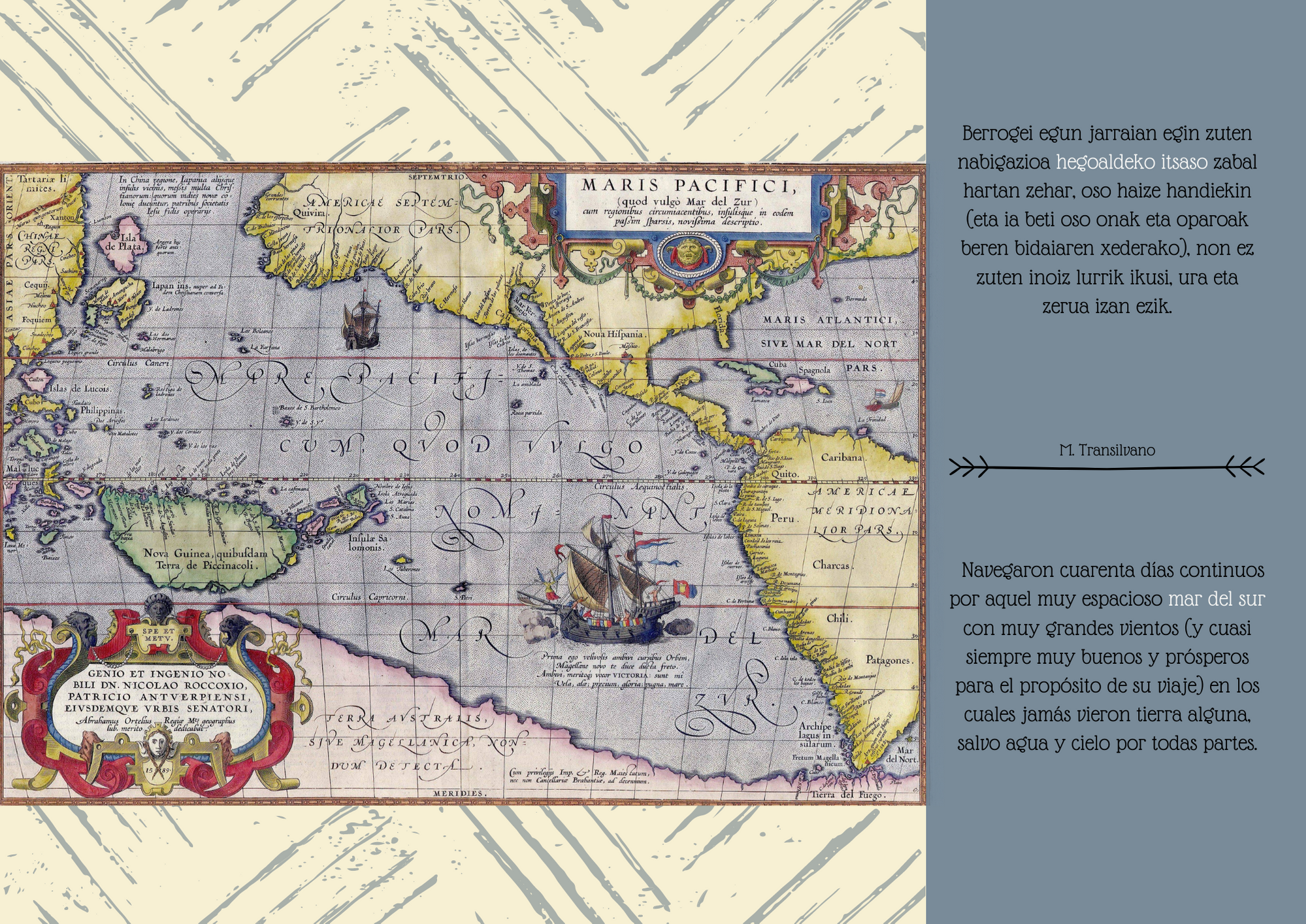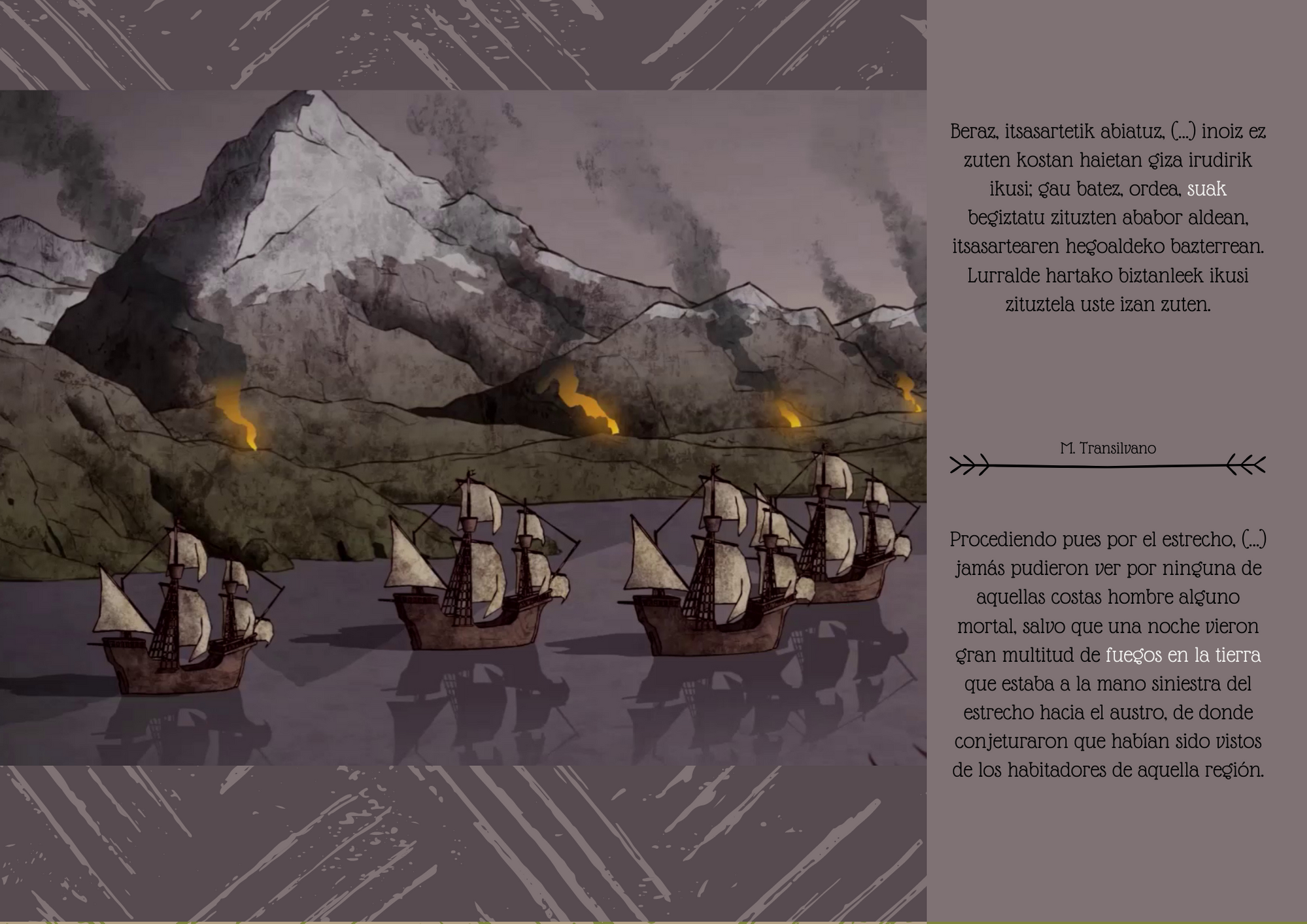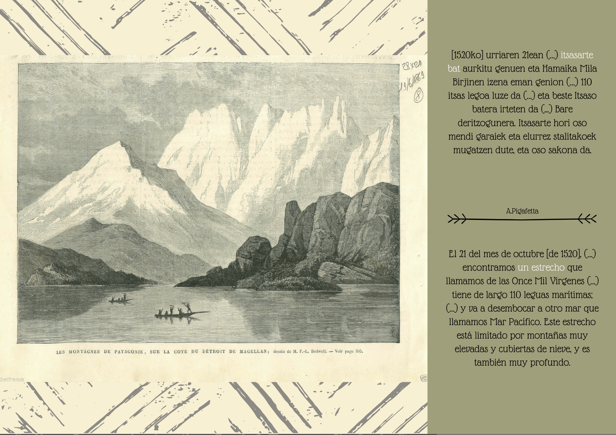 1520ko urriaren 21a eta azaroaren 28a bitartean, Espezieriako flotak Ozeano Barean sartzea ahalbidetu zien pasabidea aurkitu, esploratu eta zeharkatu zuen. Ordutik aurrera, pasabidea Magallanes itsasartea izenarekin ezagutzen da. Erakusketa honek hilabete haietako kontakizuna jasotzen du, egun haien lekuko izan ziren protagonisten hitzetan.