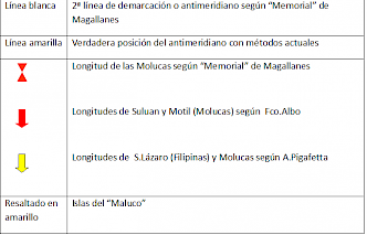 En cambio las señaladas por Pigafetta favorecían descaradamente las pretensiones de la corona castellana con unos valores que oscilan entre -17º y -29º inferiores a los reales.