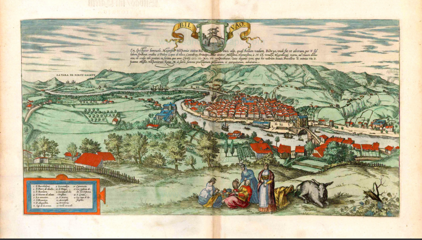 Representación de la ciudad de Bilbao en 1575, de los flamencos Franz Hogenberg, Georg Braun y Joris Hoefnagel. Se aprecia un importante tráfico de barcos desde la ciudad a la bocana.