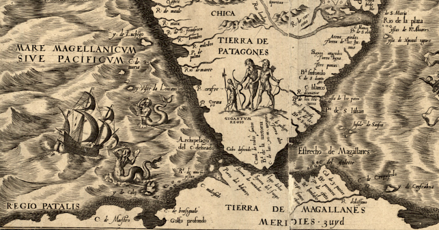 …patagoniar bat ekarri zuten itsasontzietara txalupan eta jaten eman zioten eta ardoa edaten. Asko poztu zuten beste gauzatxo batzuk ere eman zizkioten, bereziki ispilu bat; bere irudia bertan ikusi zuenez, hain zegoen ikaratuta, ikustekoa zen zer egiten zuen. Urrea eta zilarra ere erakutsi zizkioten, baina ez zuen inolako keinurik egin. Handia zen gorputzez eta itsusia. Zebra-larru bat zeraman soinean, ostrukaren lumekin egindako lumajea buruan, arku bat eta abarkak oinetan. Iluntzen ari zela ikusita, lurrera eraman zezaten keinu egin zien. Andres Urdaneta, 1536