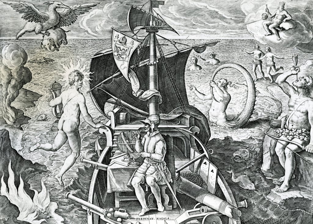 Magallaes itsasartetik irteten. Garaiko pentsamoldearen irudikapen bikaina, izaki mitologikoak eta erlijio jainkotasunak nahasten baititu. Fernando Magallaesen bidaien alegoria, Theodor de Bry (1528-1598), XVI. mendea.