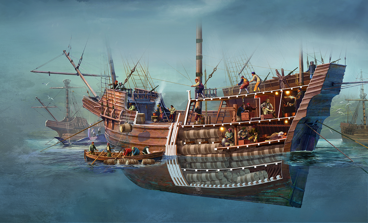 Ontziola Pasaian XVI. mendean. Euskal baleontziekin arrantza (xehetasuna). Iturria: Baptista, 2018: 38-39. National Geographic-ek irabazi-asmorik gabe lagatako ilustrazioa, Copyright National Geographic 2018.