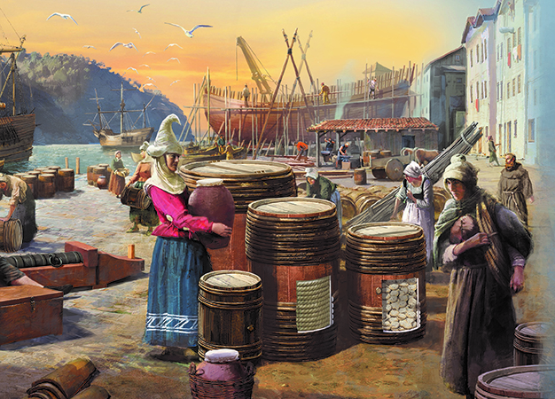 Itzultzeko prest. Arrantzan euskal baleontziekin. Iturria: Fernando G. Baptista, 2018: 46-47. National Geographic-ek irabazi-asmorik gabe lagatako ilustrazioa, Copyright National Geographic 2018.
