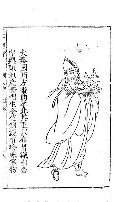 1. irudia. Da Quingo (Erromatar Inperioa) gizon baten erretratua Ming Sancai Tuhui entziklopedian, 1609an argitaratutakoan. Hauxe dio testuak: ‘Daquin:mendebaldeko merkatariek hemen amaitzen dituzte beren bidaiak. Erregeak urrezko hariz brodaturiko oihalak janzten ditu buruan. Lurrak koralak, urrezko loreak, oihal lakarrak, perlak eta abar ematen ditu. Iturria: Austriako Liburutegi Nazionala.
