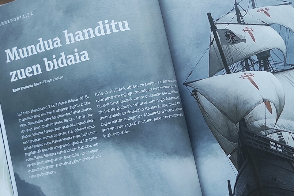 Así, el número de junio de la revista Elhuyar (papel y digital) se sumerge en ‘Mundua handitu zuen bidaia' (el viaje que ensanchó el mundo) de la mano de diferentes especialistas en la materia:  Daniel Zulaika, autor de 'Elkano, los vascos y la primera vuelta al mundo'; Nagore Davila, profesora de Geografía en la UPV/EHU y experta en cartografía; Xabier Alberdi, director del Museo Marítimo Vasco; y Virginia García, astrónoma de la Sociedad de Ciencias Aranzadi. Además, el profesor de la UPV/EHU Alvaro Aragón desvela los orígenes de los bosques trasmochos, protagonistas del paisaje boscoso tradicional de Euskal Herria.